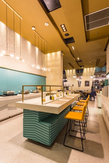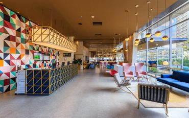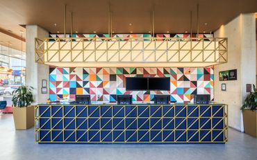 This specific urban condition served as an inspiration for the designer, Architect Natalia Heredia - director of the firm Interior 1, to develop the renovation of the lobby and common areas of the hotel. Inspired by the decade of the 50 ́s, by its pastel colours and the geometric shapes that were found in all the built environments at that time, she developed a dynamic and attractive design with a radically contemporary character. The main pieces of furniture, the reception desk and the bar, are structured by golden geometric elements, sober and elegant, that serve as contrast and at the same time complement the array of colours and textures set out for the background.